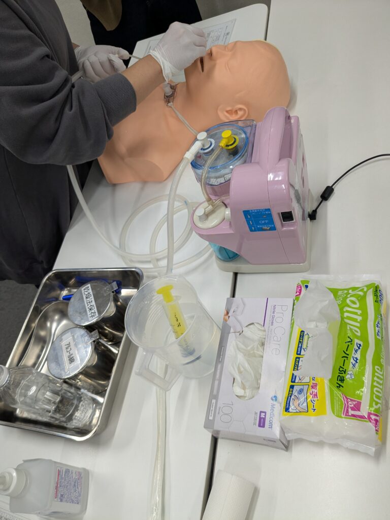 写真のように(これは吸引だけですが)人体模型を使って、実際に吸引を行う介護職員役と指導する看護師役を分担します。残念ながら臨床から遠く離れてしまった看護師以外は、ほとんどがスムーズに行えており、助言はごくわずかでしたが、他人に見られる・基礎手順で行うとなると、やはり緊張はしました。
